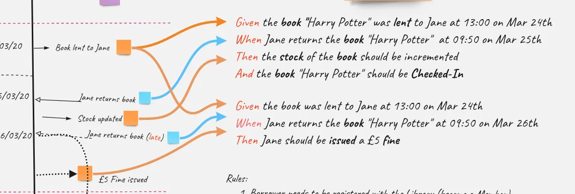 Example Mapping, another collaborative technique invented by Matt Wynne, focuses on deriving use-cases or scenarios from business rules. The output of an Example Mapping session is a set of clear-cut examples of how of a user would use the required system; the examples must be concrete enough to be translated into executable specifications (e.g. gherkin). For example, each “feature”, or “capability” of the system is focused on in turn. The business rules are clearly spelt out (for example “members are fined £5 if a book is returned late”) and these examples are teased-out collectively by the product owner and the team.